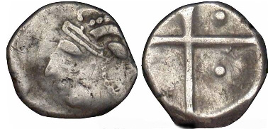 Obverse: Helmeted head facing left, helmet decorated