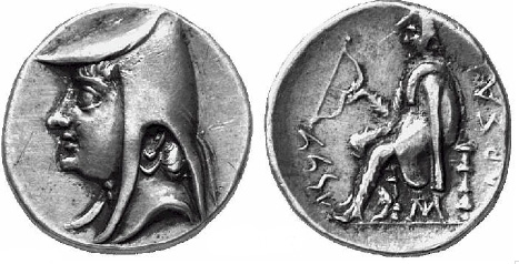 Reverse: Archer seated on throneholding a bow with monogram M below