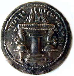 Reverse: Zoroastrian fire altar with two attendants standing on each
