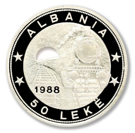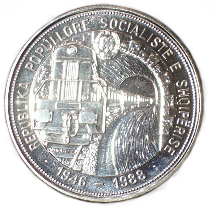 Obverse: A modern deisel engine train with Coat Arms of Albania