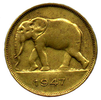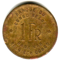 Reverse: 1 Fr in the center and the legend 'Bank of Belgian Congo'