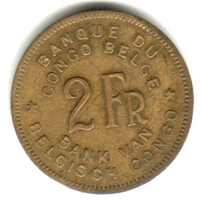 Reverse: 2 Fr in the center and the legend 'Bank of Belgian Congo'