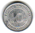 Reverse: 10 s surrounded by a legend ' National bank of Congo' in French.