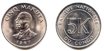 Obverse: Bust of President Joseph-Desire Mobutu with Five Makuta in