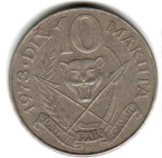Reverse: Congolese Coat of Arms with legend Ten Makuta and year in