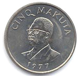 Obverse: Bust of President Joseph-Desire Mobutu with Five Makuta in