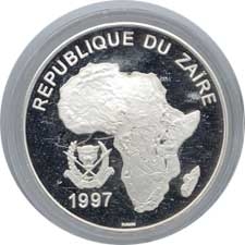 Obverse: Africa map and Congolese Coat of Arms with a legend