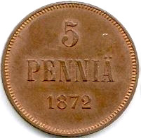 5 Penniä. Copper. 1872-75 CE.