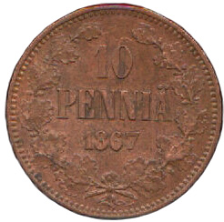 10 Penniä. Copper. 1865-67 CE