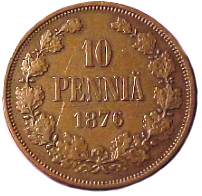 10 Penniä. Copper. 1875-76 CE