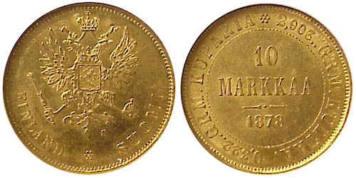 10 Markkaa. Gold. 1878 CE
