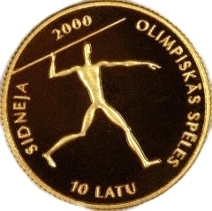 Reverse: A javelin thrower. Inscription - SIDNEJA 2000 OLIMPISKAS SPELES (Sydney 2000 Olympic Games) & 10 LATU.
