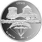 Reverse: The Cesis Castle in the upper part and reflection of a Hanseatic ship in the lower part. Inscription