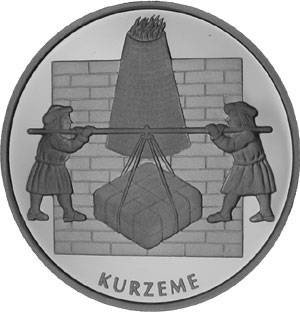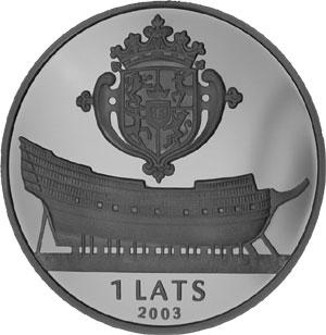 Obverse: Coat of arms of the Duchy of Kurzeme and Zemgale and ship being build. Inscription - 1 LATS & 2003.