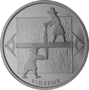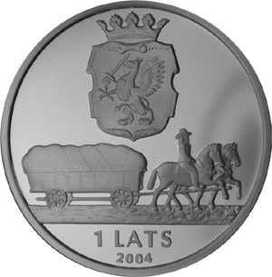 Obverse: Vidzeme coat of arms and a peasant pulling a two horse cart with hay. Inscription - 1 LATS & 2004.
