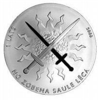 Reverse: Two crossed swords against the background of Sun Inscription - NO ZOBENA SAULE LECA (Sun was rising from the sword), 1