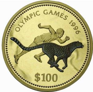 100 Dollars. K11 1996 Obverse: Namibian Coat of Arms. Reverse: Olympic games commemoration - Runner and cheetah.