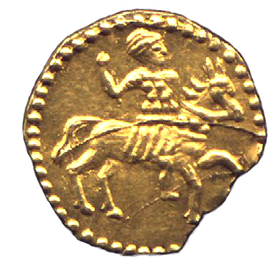 Gold Kopek novodel of Ivan V. Obverse: Knight on horseback . Reverse: Inscription in Cyrillic Weight: 0.45 grams. Diameter: 10millimeters. Reference: Schubert-98.