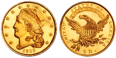 Gold 5 Dollars (Half Eagle) 1834-38.