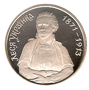 Obverse: Portrait of the poetess Lesya Ukrainka with inscriptions: